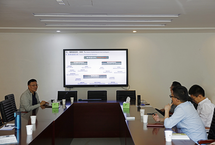 Later, he began to talk about the industrial status and research status of the plant-based artificial meat. He said, in the 1960s, Japan and the United States began to do research and develop the industrial production line of vegetable protein, including protein powder, concentrated protein, isolated protein, and organized protein. China did not have the industrial production line of vegetable protein until the 1980s, and China's plant protein industry gradually developed during the following 40 years. The soybean research team of Northeast Agricultural University made a soybean tissue protein production line and developed relevant products during the twelfth five-year plan period.