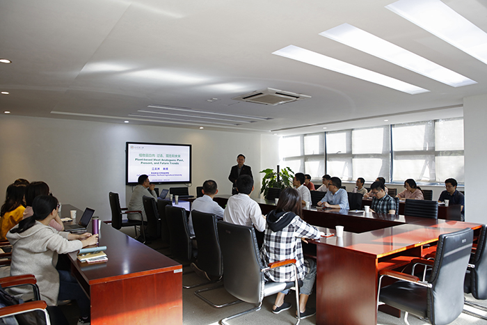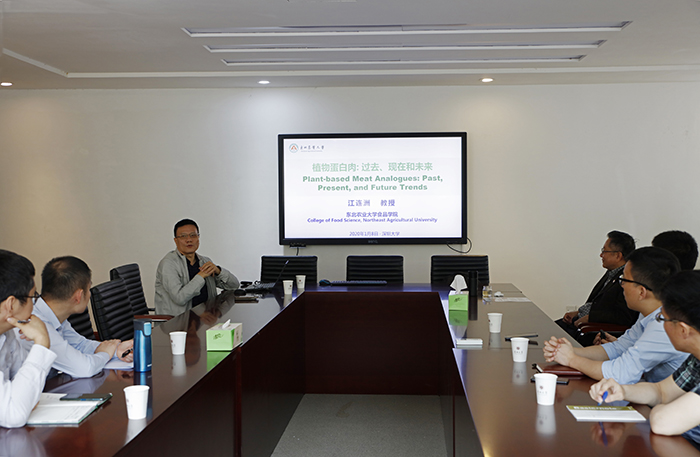 Prof. Lianzhou Jiang delivered a report which entitled The Past, Present, and Future of Plant-based Meat in the meeting room 103 of Huiyuan Building at 10:00 a.m.on January 8, 2020. As we all know, artificial meats are very hot in 2019. Plant-based artificial meat is one of the artificial meats, which is made using plant proteins as the main content, supplemented with respective auxiliary ingredients, and treated through selected processing to yield animal tissue-like texture and taste. In the report, Prof. Jiang first explained the historical development process and product development process of plant-based artificial meat humorously, thus making people have a deep understanding of how plant-based artificial meat developed in the past.