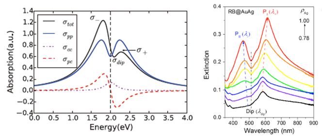 图1. 左:理论上等离激元-激子杂化体系的光谱非对称性。右:实验测量的金银合金纳米颗粒/罗丹明耦合杂化体系消光光谱与银含量的关系。