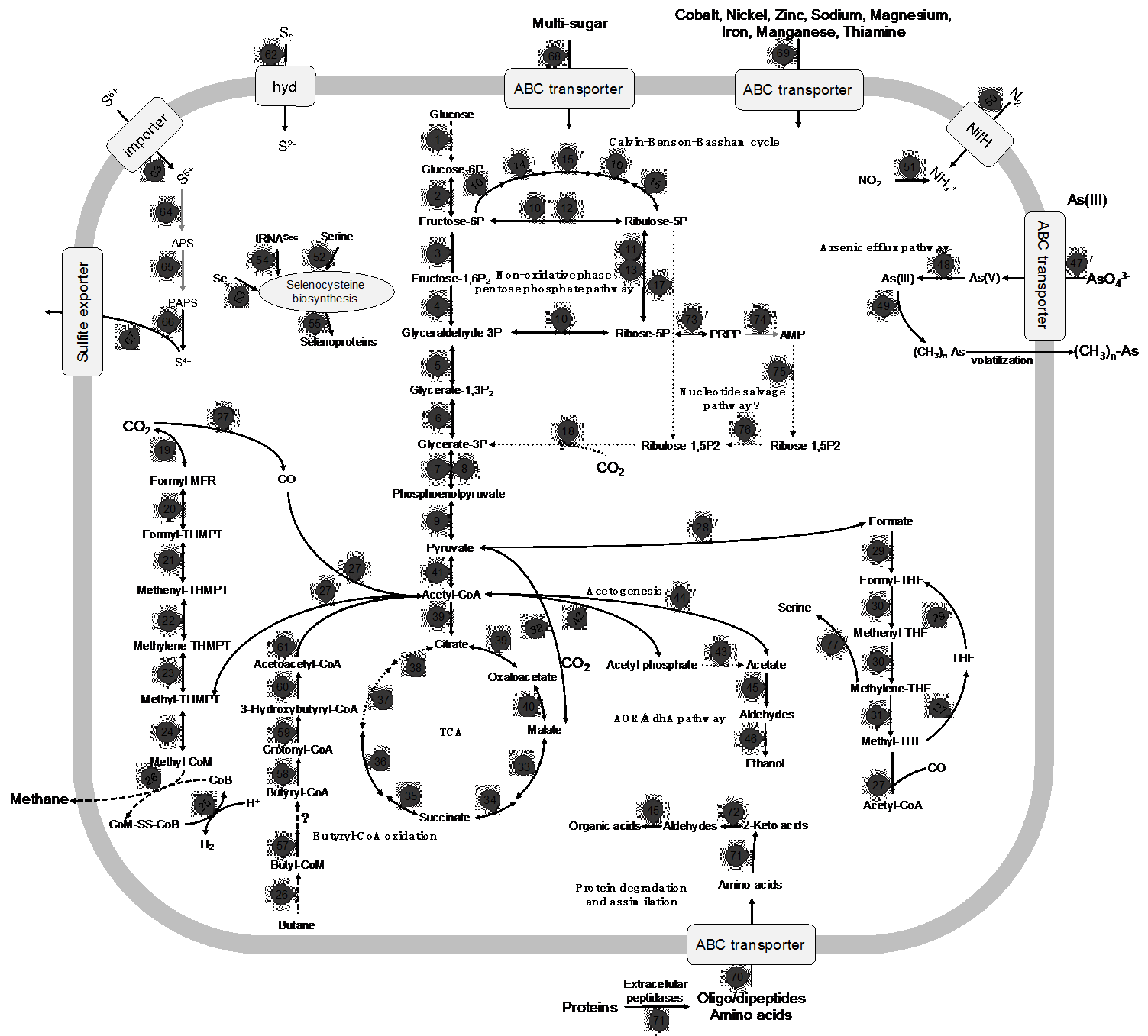 古菌作为微生物的一个重要组分,在地球生命演化过程中扮演着极为重要的角色。自从2015年洛基古菌的发现,到2016年的索尔古菌,以及最近Asgard古菌超级门的发现和建立,这一类在极端和普通环境下都有所分布的古菌被认为是迄今以来,距离真核生物起源最近的一类古菌。基于这一类古菌的基因组和功能代谢预测研究为理解真核生物的起源与生命之树的系统发育开辟了新的研究道路。李猛教授团队与香港大学生物科学学院顾继东教授、美国德克萨斯大学奥斯丁分校Brett J. Baker教授合作,采用宏基因组和生物信息学技术手段,在深圳湾红树林湿地沉积物中获得了索尔古菌的三个高质量基因组草图。通过基因组的精细分析发现,索尔古菌具有降解有机质、固定无机碳、还原硫单质或硫酸盐,以及产乙酸等代谢途径(图1)。研究结果对于认识古菌在生态环境中的作用以及揭示真核生物起源等方面都有十分重要的意义。