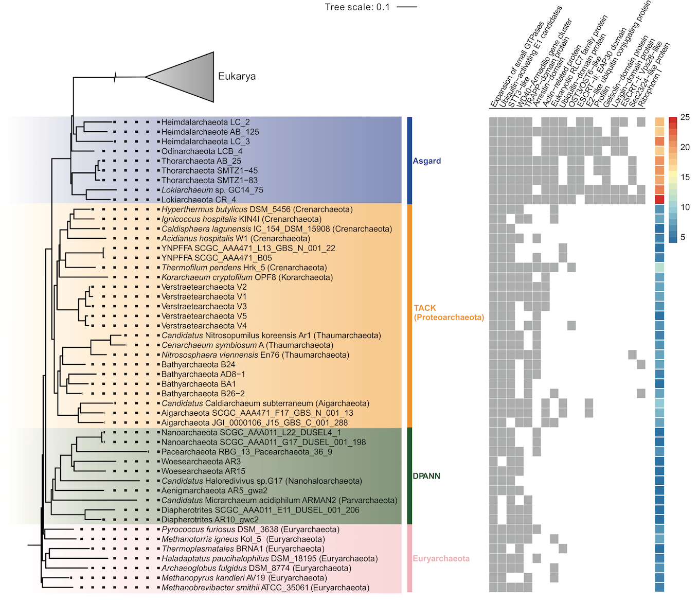 图2 古菌与真核生物的核糖体蛋白进化树(左),以及古菌基因组中相对应的真核特有基因的数量(右)