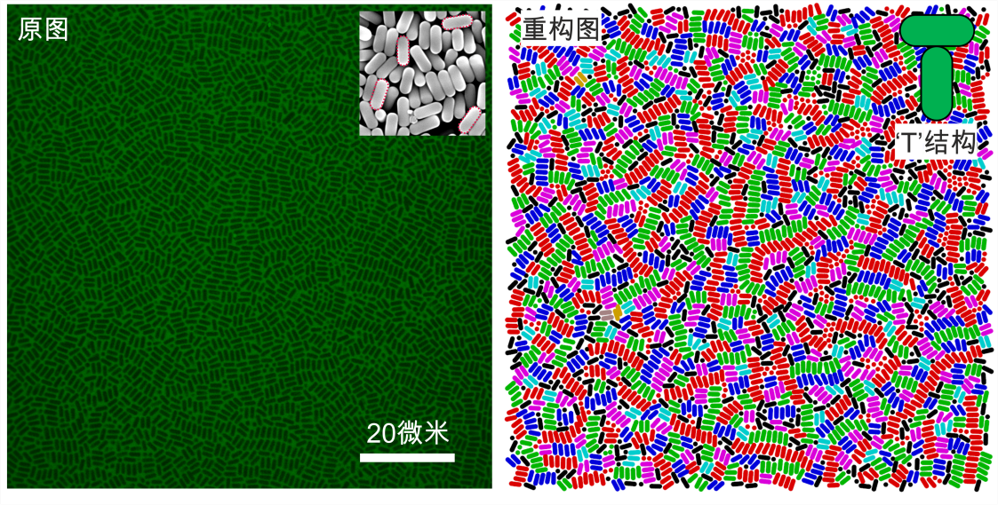 高永祥研究员与牛津大学Dirk Aarts与Roel Dullens教授合作,将二氧化硅(玻璃的主要成分)棒限制在平面上作为二维短球柱模型体系,并研究了该体系结构随堆积密度的变化。结合共聚焦显微术(左图)与图像处理,精准地在单粒子尺度观测体系的结构变化。通过结构重建与分析(右图),揭示了二维短球柱体系在高浓度时自我陷入由一维细丝状团簇堆砌成的无序结构。该工作的主要贡献是发现了扰乱结晶过程及结构粗化的自中毒机理,即体系自发地形成‘T’结构,而该结构与结晶和细丝团簇生长均不相容。之前,自中毒机理只在计算机模拟当中被预测过。这项工作为利用形状控制自组装微纳米结构提供了新的见解与知识。