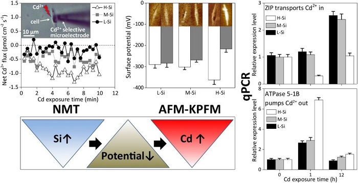 Thereby, Pan Ke’s group tried to evaluate the role of silicon (Si) in counteracting cadmium (Cd) toxicity in the marine diatom Phaeodactylum tricornutum in their studies. They first demonstrated that Si enrichment dramatically enhanced Cd tolerance and changed the Cd accumulation in the diatom. Their modeling suggested that Si-enriched cells adsorbed more Cd but had a higher Cd elimination rate than the Si-starved cells. Examinations by atomic force microscopy and X-ray photoelectron spectroscopy revealed that the Si-enriched cells had better silification and more SiO− in the cell walls, which markedly lowered the surface potential of the diatom cells and allowed them to attract more Cd. Although the Si-enriched cells tended to have a high Cd burden when facing Cd stress, they suppressed the increase of intracellular Cd by both down-regulating the influx transporter ZIP and up-regulating the efflux transporter ATPase5-1B. Pan Ke group’s study shows the significant roles Si plays in maintaining metal homeostasis and combating Cd challenge in marine diatoms.