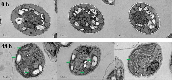 Fig. 2: Transmission electron micrographs of thin-sectioned, heterotrophically-grown C. zofingiensis cells 3 h before and 48 h after glucose consumption (Green arrows: emerging chloroplast; ST: starch granules; LD: lipid droplets)