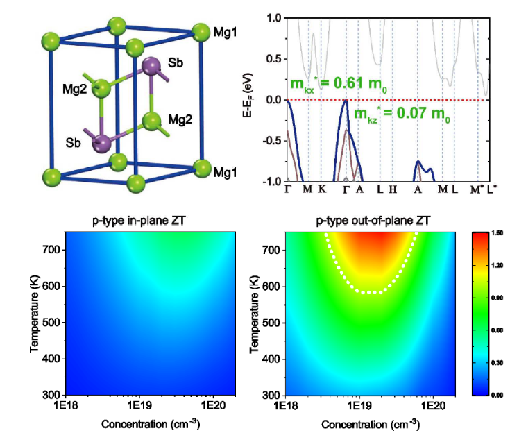 Considering that most of the experimental data were measured from Mg3Sb2 polycrystalline system, Dr. Wu Li's group employed the state-of-the-art first-principles approach to calculate the thermoelectric properties along the different principal axes of single crystalline Mg3Sb2. It was found that the ZT of n-type Mg3Sb2 was nearly isotropic, and the ZT value was in good agreement with the experimental data. For the p-type counterpart, the strongly anisotropic effective mass near the band edge leads to an anisotropic ZT. In the direction of perpendicular to the ab plane, the ZT value can reach 1.5 at 750K, which is much higher than that reported in previous experimental studies in the polycrystalline system. This study provides a feasible way to improve the thermoelectric performance of p-type Mg3Sb2, that is, to improve the ZT of polycrystalline p-type Mg3Sb2 through oriented textured structure.