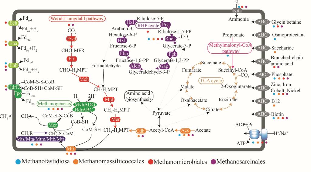 (Figure 1: Predicted metabolic pathways in the four dominant methanogen lineages)