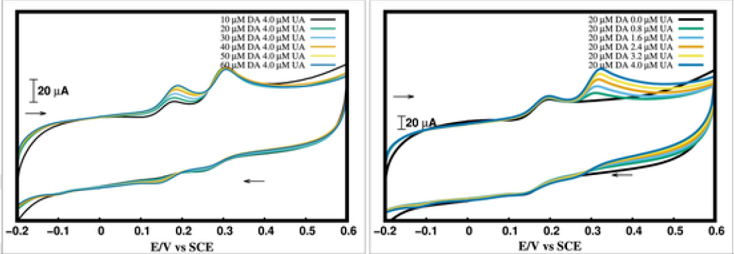 Fig 1: Cyclic voltammetry of the cetyl pyridinium bromide modified carbon paste electrodes for the simultaneous detection of dopamine and uric acid, demonstrating the high selectivity and sensitivity for such electrodes.