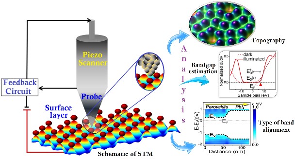 Energy consumption is an international issue faced by scientists in the world. As such, perovskite-based Solar Cells have attracted much attention in recent years. In this field, the Organic/Inorganic Hybrid Perovskites Solar Cells stand out as a promising candidate for next-generate energy sources. Not only the synthetic chemists but also the materials scientists concern very much the mechanism that underpins the extremely high efficiency of the perovskite-based solar cells. Traditionally, scanning tunneling microscope and atomic force microscope are used for imaging sample morphology. Now, the nanoscale explorations using scanning tunneling microscope/spectroscope (STM/STS) present their powerful ability to unveil these existing issues such as inhomogeneity on the surface, within the materials, and at the interface. In this regard, Prof. Lee’s group have focused on the recent developments in perovskite materials using STM/STS to unravel the fundamental properties especially crucial for perovskite materials and solar cells progress. They get started from sample preparation in STM followed by giving elegant examples that present the detailed analysis via STM/STS in the topic.