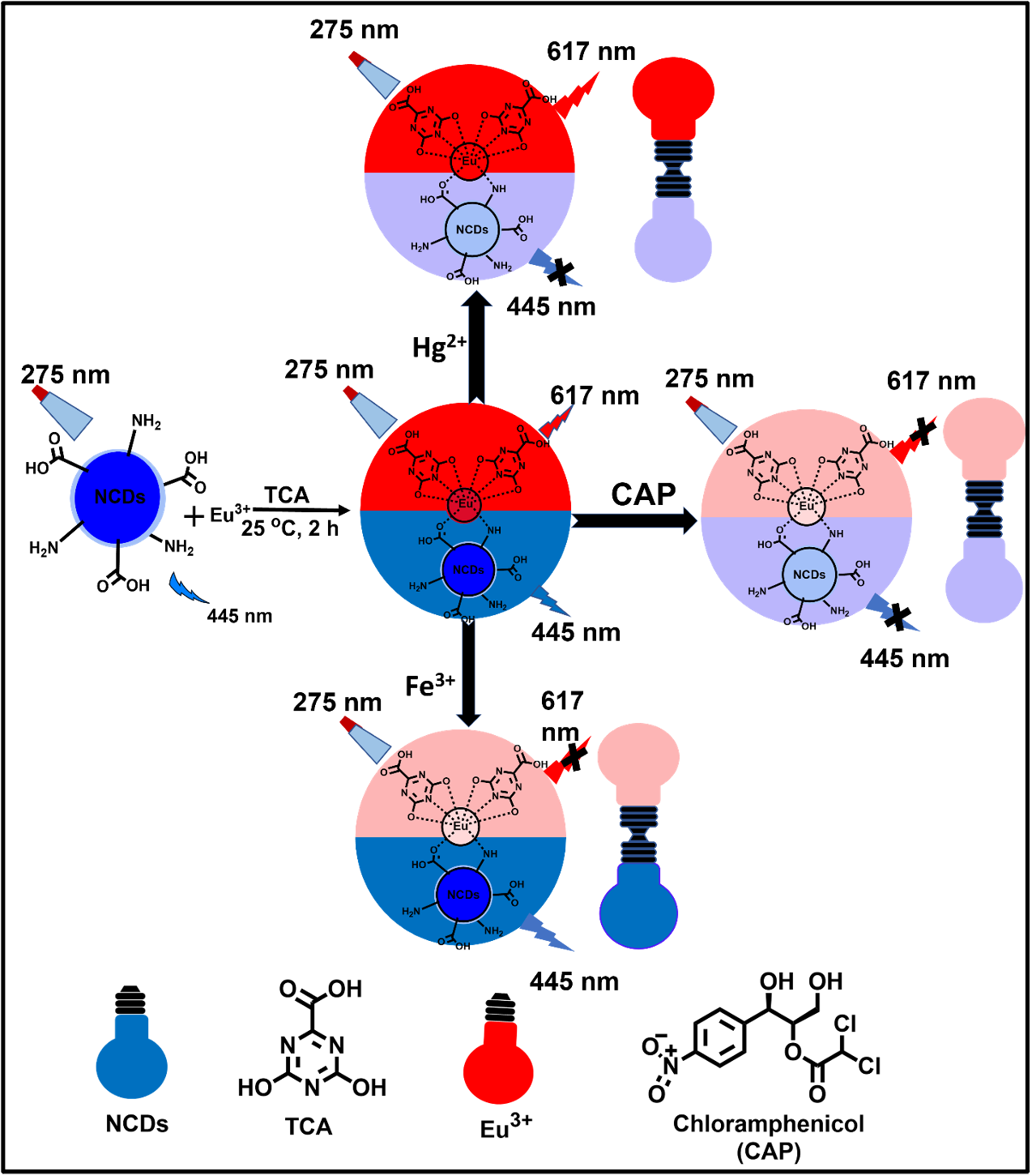 Lanthanide functionalized N-doped carbon dots have potential applications in the development of innovative photoluminescence probes for environmental and biological analytes. In this study, a novel multifunctional dual-emissive fluorescent probe based on europium complex with 4,6’-dihydroxy-1,3,5’-triazine-2-carboxylic acid and N-doped carbon dots (Eu-TCA/NCDs) is reported for the selective detection of chloramphenicol (CAP), Hg2+ and Fe3+ in real samples. At an excitation wavelength (λex = 275 nm), the aqueous solution of the Eu-TCA/NCDs probe exhibited strong fluorescence emission at two different wavelengths (445 and 617 nm). Under the same conditions, the addition of CAP to the probe resulted in significant fluorescence quenching at both emission wavelengths. An excellent linear relationship (R2 = 0.9963) between the concentration of CAP (0.01-50 µM) and fluorescence quenching was observed with a detection limit of 12 nM. Furthermore, the probe demonstrated a ratiometric response in the presence of Hg2+ and Fe3+ ions. The addition of Hg2+ cause substantial quenching at 445 nm while the intensity at 617 nm almost remains unchanged. However, upon addition of Fe3+ the fluorescence intensity at 617 nm decreases sharply while the intensity at 445 nm remains same. Furthermore, the practical applicability of the probe was authenticated by the detection of CAP, Hg2+ and Fe3+ in real samples (with RSD ≤ 2.35%) with a recovery percentage of 95.2-103. These results open a new avenue for developing lanthanide-doped nanocomposites that display white-light-based dual-emissive fluorescence recognition of biological and environmental pollutants.