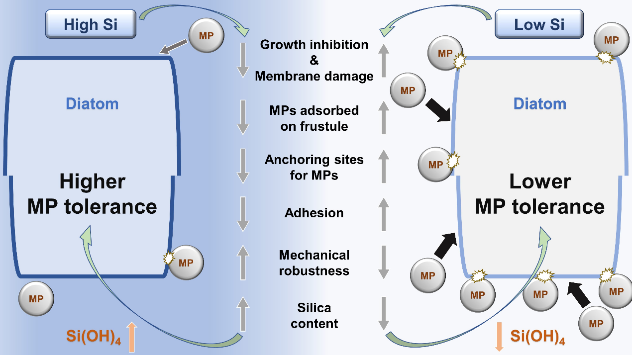 Recently, Prof. Pan Ke from the Institute for Advanced Study at Shenzhen University published a research paper titled “Silicon Limitation Impairs the Tolerance of Marine Diatoms to Pristine Microplastics” (DOI: 10.1021/acs.est.2c09305) in the authoritative journal “Environmental Science & Technology” in the field of environmental science (IF: 11.357; JCR Q1). The paper reveals the changes in the tolerance of marine diatoms to microplastics under dynamic nutritional conditions. The first author of the article is PhD student Mr. Fengyuan Chen (SZU-HKUST Joint PhD Program in Marine Environmental Science), and the corresponding author is Prof. Pan Ke.