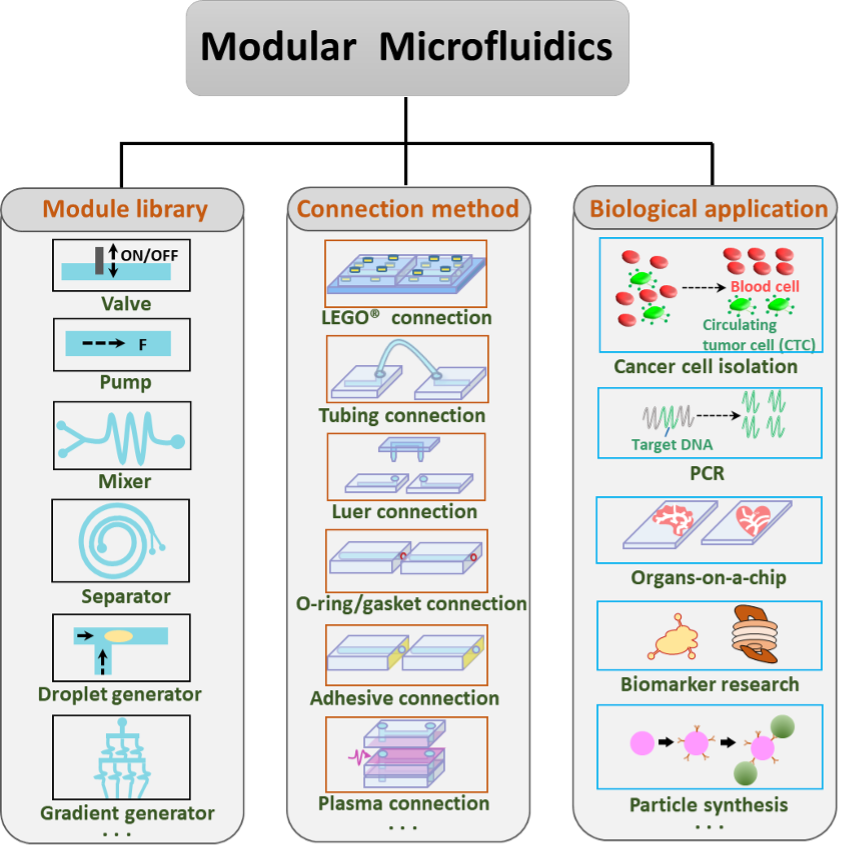 Due to the superior characteristics of modular microfluidics, including portability, on-site deployability, and high customization, Dr. Yan Sheng's research team at the Institute of Advanced Study at Shenzhen University reviewed the latest advances in modular microfluidics research and discussed their future prospects. In this review, the working mechanism of basic microfluidic modules is first introduced, and their feasibility as modular microfluidic components is evaluated. Then, the connection methods between these microfluidic modules are introduced, and the advantages of modular microfluidics in biological applications relative to integrated microfluidics are summarized. Finally, the challenges and future prospects of modular microfluidics are discussed.