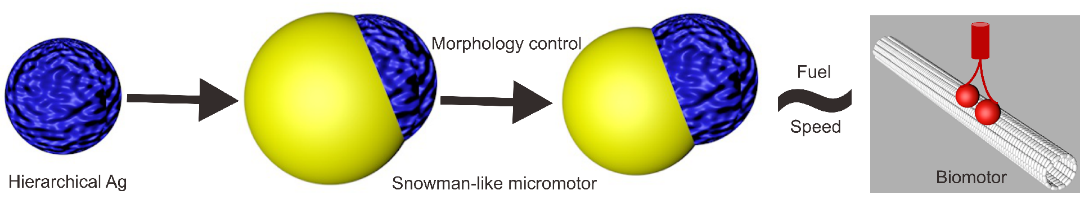 In this work, Prof Gao’s team designed a snowman-like micromotor based on hierarchical catalytic silver microparticles. By optimizing their morphology, they showed that these micromotors self-propel in mM level of H2O2 at a speed up to 90 mm/s (or 40 body length/s) and generate a force of 1 pN and a power of 0.1 fW, approaching those of biomotors. They have improved the energy efficiency of chemically-driven synthetic micromotors by at least two orders of magnitude.