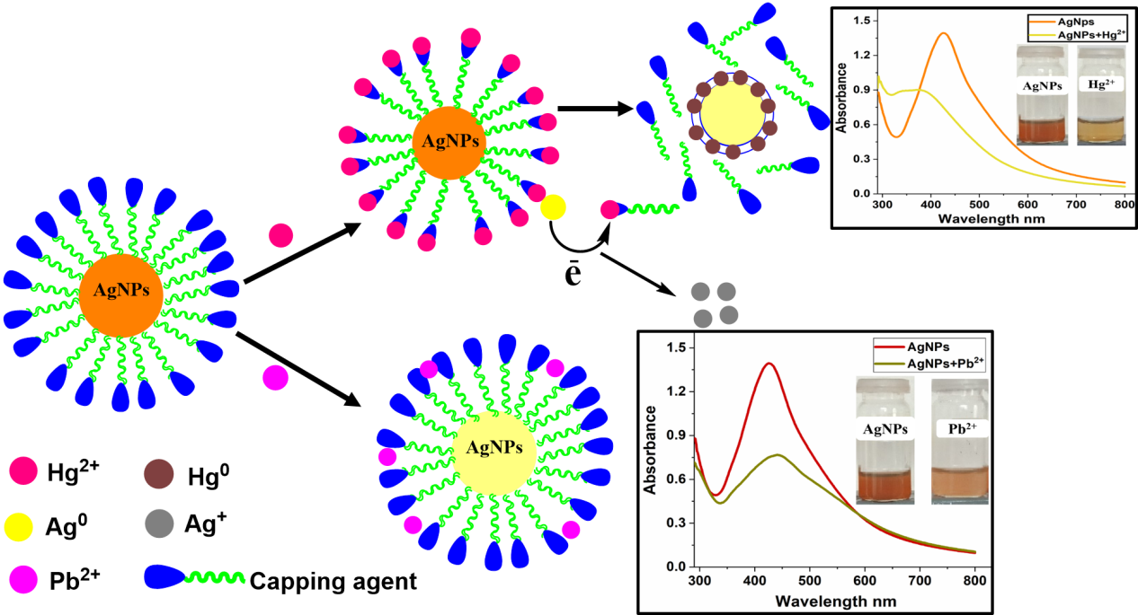 Environmental pollution derivated from toxic metals and organic toxins is becoming a serious issue worldwide because of their harmful effects on the ecosystem and human health. Here we are reporting an extremely selective and cost-effective colorimetric sensor for simultaneous recognition of Hg2+ and Pb2+ by using green synthesized silver nanoparticles (AgNPs) mediated from the environmental friendly roots extract of Bistorta amplexicalius. Biogenic synthesized AgNPs were well characterized by various spectroscopic techniques e.g. UV-vis, FT-IR, XRD, AFM, and Zetasizer. The photophysical potential of synthesized AgNPs towards common metal cations was explored via absorption spectroscopy and colorimetric assay. The hypsochromic shift in the SPR band of AgNPs can easily be detected through naked eyes vision from dark brown to light yellow in the case of Hg2+. A substantial reduction in the absorbance of AgNPs was recorded upon mixing with Pb2+. AgNPs based colorimetric sensor is highly sensitive towards Hg2+ and Pb2+ with a limit of detection (LOD) of 8.0×10-7M and 2.0×10-7M for Hg2+ and Pb2+ respectively. Furthermore, AgNPs showed promising catalytic activity for the degradation of methyl orange dye. These results demonstrate that Bistorta amplexicalius stabilized silver nanoparticles have potential applications as a colorimetric sensor and an effective catalyst for the degradation of methyl orange.