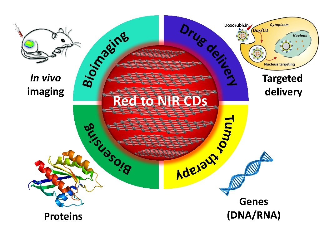 Graphic:The fundamental strategies, photoluminescence mechanisms, potential biomedical applications, and key challenges with prospects of Red/NIR-CDs are reviewed.