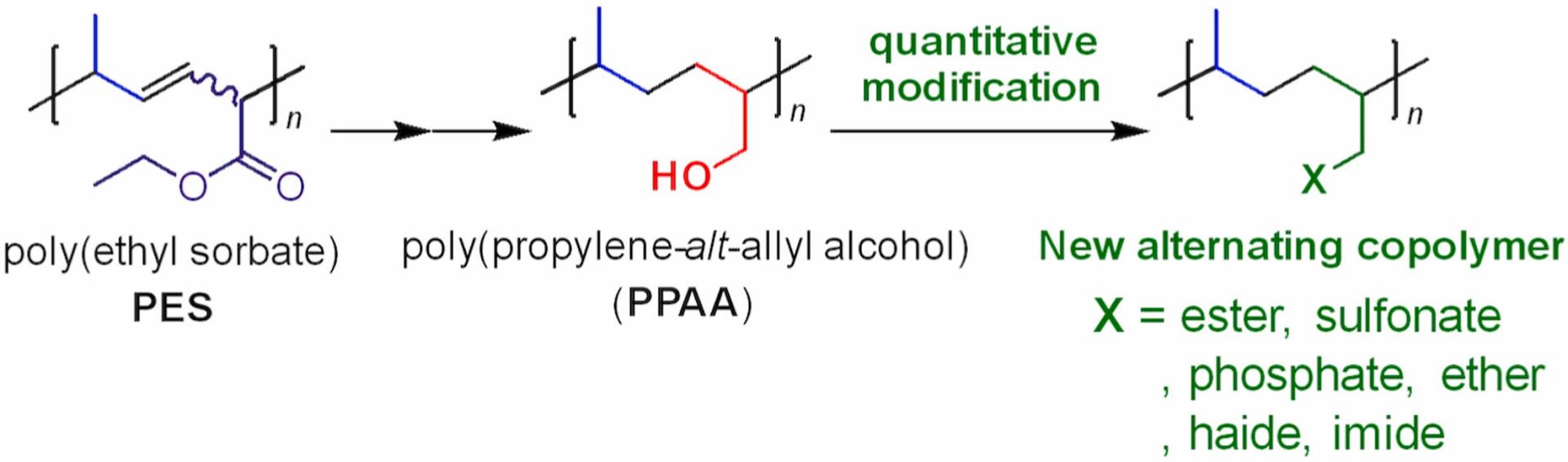 In this work, a polar conjugated diene polymer, poly(ethyl sorbate), was prepared by organocatalyzed group transfer polymerization, and its derived product (PPAA) obtained by hydrogenation and reduction was chemically modified. Eight novel alternating copolymers that are not accessible with general polymerization methodologies have been synthesized, providing a new route for the synthesis of accurate alternating copolymers.