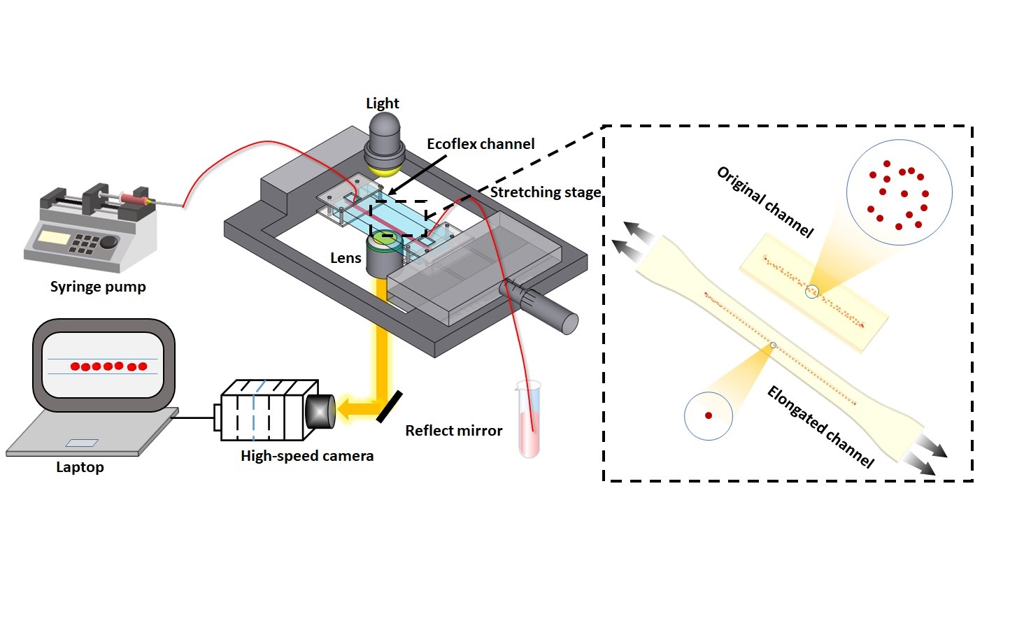 Haematococcus pluvialisis a good source of astaxanthin, which reduces oxidation in the human body, treats inflammation, and even slows the growth of breast and skin cancer cells. Since the size ofHaematococcus pluvialisis often closely related to astaxanthin yield, size-based microalgal separation has far-reaching significance for high-value algae extraction and algal directed evolution. Elasto-inertial microfluidics is able to achieve three-dimensional (3D) focusing in a simple straight channel without any external force fields or complex channel structures. Particle size is a predominant parameter for elasto-inertial focusing and separation. The cut-off threshold of particle separation is highly dependent on the blockage ratio. For microalgal cell separation, the cell size is pre-determined and tuning the blockage ratio requires changing the diameter of the microfluidic channel. However, the channel geometry is difficult to alter once a device has been prototyped in the existing rigid microfluidic devices. Therefore, the current rigid devices cannot be used for microalgal separation with the uncertain separation cut-off sizes due to the fixed channel geomerty. Therefore, it is of certain research value to develop a stretchable microfluidic device that can flexibly adjust the geometry of the microfluidic chip in real time and realize the dynamic adjustment of the cut-off size of microalgae separation.