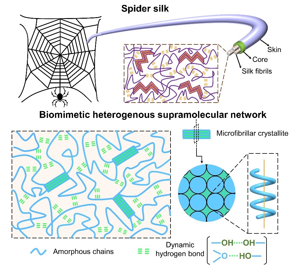 Inspired by the molecular chemistry and structure of spider silk, Prof. Dr. Siya Huang’s team from the Institute for Advanced Study at Shenzhen University developed a structurally heterogeneous supramolecular network with all-round adaptabilities by evaporation-induced self-assembly of hydrogen-bonded macromolecules. The supramolecular network consists of both hard (crystallites) and soft (amorphous) phases with dynamic hydrogen bonds, exhibiting strong strain, time and hydration dependency with adaptive mechanical and structural responses to varying strain, deformation rate as well as moisture. Through multifunctional crosslinking, the network exhibits silk-like attributes with an extensibility of >130%, intense strain-stiffening (6-fold modulus enhancement), high damping capacity (>80%) over a wide range of strain rate, and moisture-triggered large supercontraction (contraction ratio of >50%). Artificial materials with such combined adaptiveness under bio-benign conditions are promising for applications in biomimetic and biomedical fields.