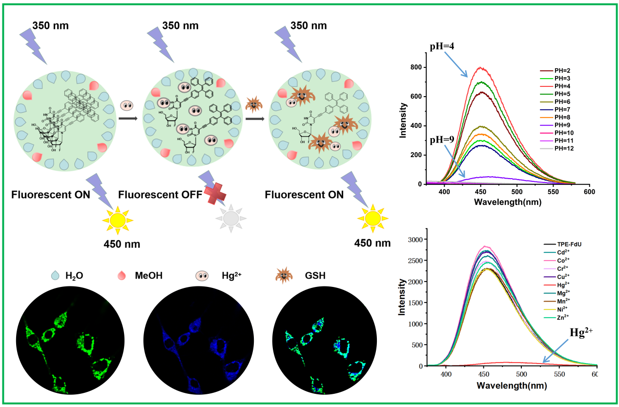 Biocompatible fluorescent probes have emerged as essential tools in the life sciences for visualizing subcellular structures and detecting specific analytes. Herein, we reported the synthesis and characterization of a novel fluorescent probe (TPE-FdU), incorporated with hydrophilic 2′-fluoro-substituted deoxyuridine and hydrophobic ethynyl tetraphenylethene moieties, which possessed a typical aggregation-induced emission (AIE) behavior. In comparison to the TPE-FdU (pKa 7.68) treated in neutral conditions, it performed well at pH 4, exhibiting an enhanced 450 nm emission signal of approximately four times stronger. As the pH value was increased to 10, the fluorescence intensity was completely quenched. The TEM images of TPE-FdU in acidic environment (nano-spherical morphology, AIE enhance, pH=4) and in a basic environment (microrods, fluorescence quenching, pH=9) revealed that it was apH-dependent self-assembled probe, which also illustrated by the interpretation of the NMR spectrum. Furthermore, the TPE-FdU probe exhibited a specific response to trace Hg2+ions. Interestingly, the quenched fluorescence of the TPE-FdU probe caused by Hg2+can be recovered by the addition of GSH due to the formation of the Hg-S bond released away. MTT assay and CLSM images demonstrated that TPE-FdU was nontoxic and selectively visualized in the intracellular mitochondria. These results contributed to the development of advanced fluorescent probes with diverse applications in cell imaging, environment protection, and biomedical research.