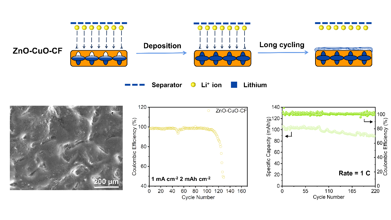 Because of the large thermal expansion coefficient of copper oxide, cracks anddefoliationare fromed upon combustion on commercial copper foam, resulting in ununiform lithiophilic site distribution. In this study, we take use of the hydrophilicity difference between copper and copper oxide and propose another stage of zinc oxide (small thermal expansion coefficient) growth throughthesolution-combustion method on the as-formed substrates to ensure a highly lithiophilic surface. Therefore, the Li@ZnO-CuO-CF sample exhibited a uniform Li+flux deposition and high capacity retention when coupled withanLFP cathode.