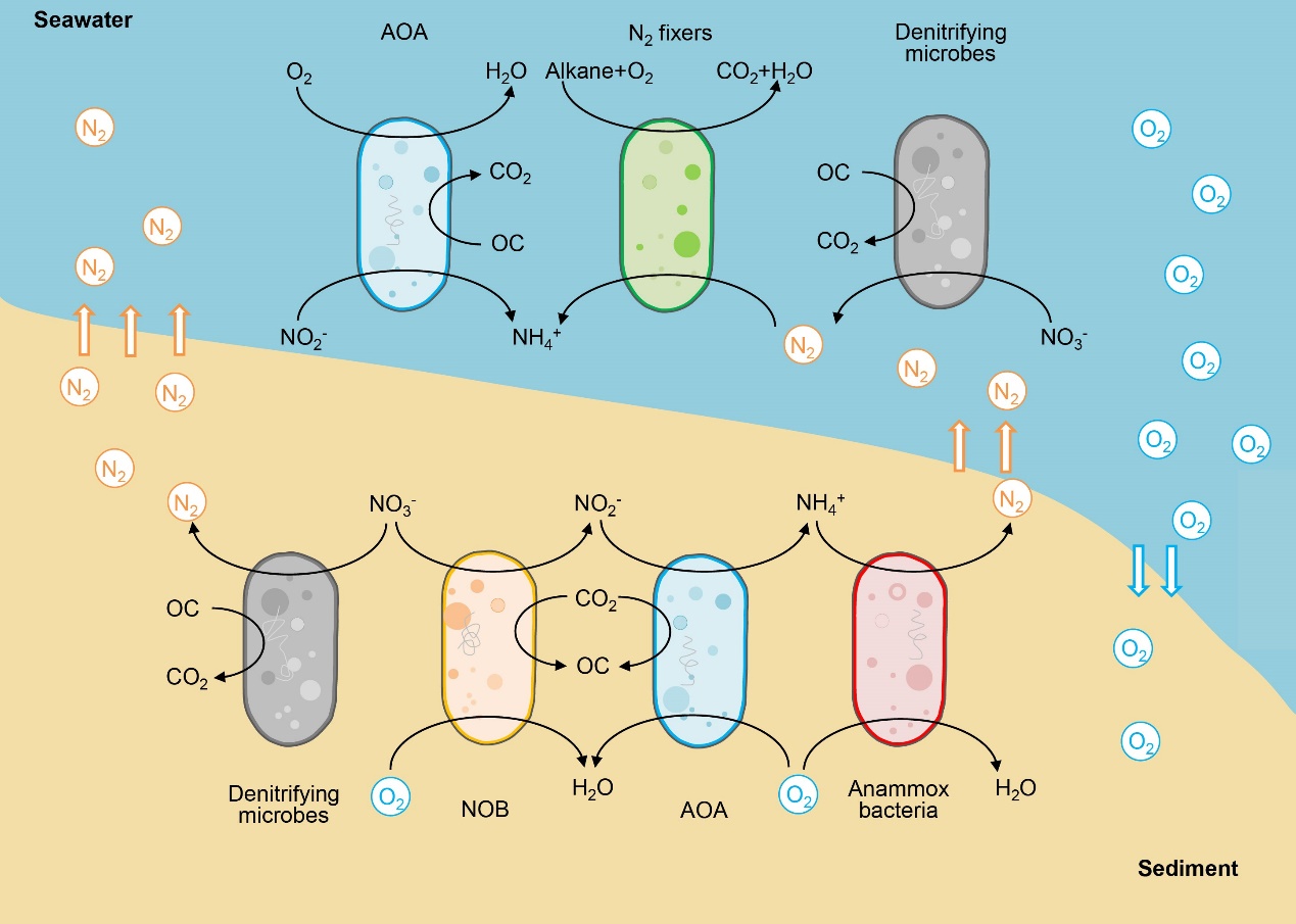 In this study, comparative metagenomicapproacheswere used to investigate the microbial nitrogen cycling in the MT sediments and seawater.The results showed that fives newnitrite oxidizing bacterialineages are present, and anammox bacteria might be capable of aerobic respiration in the MT sediments, while the alkane-degrading bacteria have potential for nitrogen fixation in the MT seawater. These findings expand our understanding of the microbiallifein response to extreme environment.