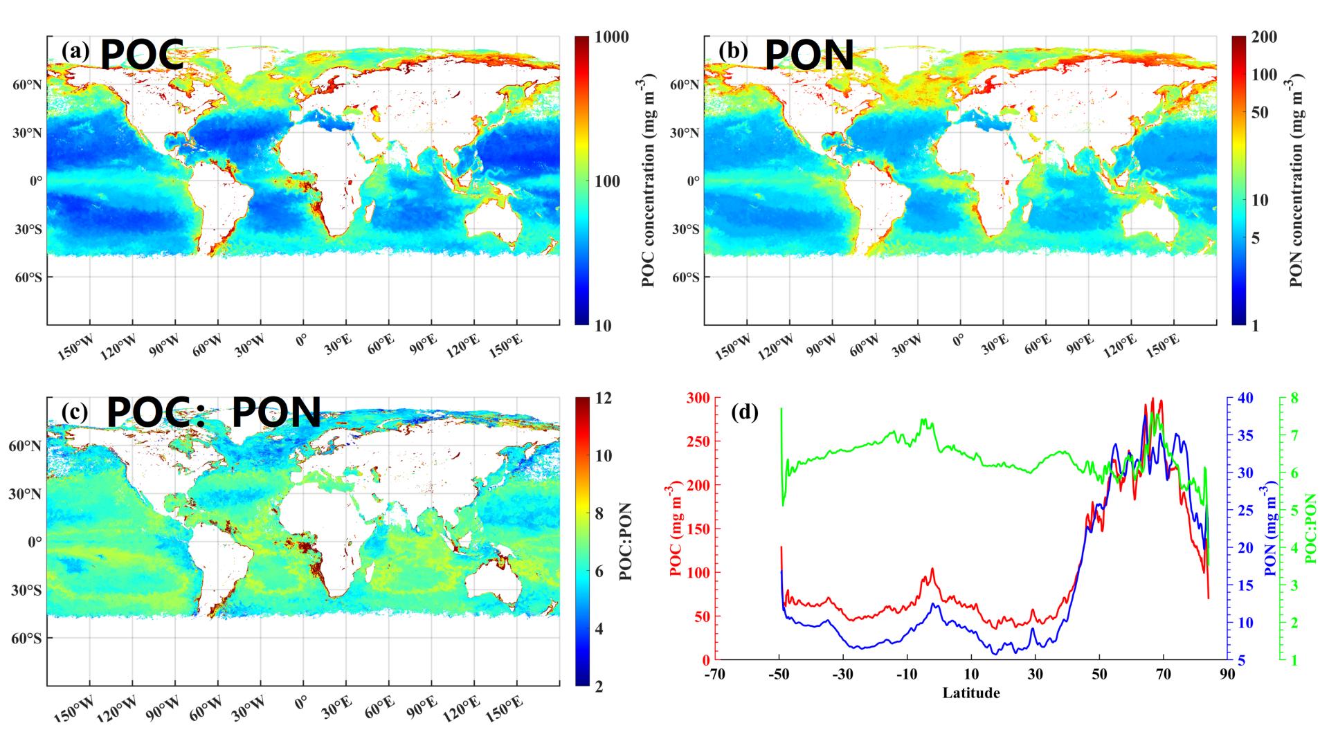 Satellite remote sensing technology has the capability for large-scale and high-frequency monitoring, yet there have been few reports on the feasibility and applicability of remote sensing inversion of marine particulate organic nitrogen (PON). The research group collected global in situ PON measurements and mainstream ocean color satellite remote sensing products from sensors such as SeaWiFS, Terra-MODIS, MERIS, Aqua-MODIS, and SNPP-VIIRS. They extracted synchronous observation datasets from both satellite and in situ measurements, identified the bio-optical indicators suitable for the remote sensing inversion of marine PON, and applied artificial intelligence methods to develop accurate remote sensing inversion models for oceanic PON concentrations. A long-term remote sensing dataset of global oceanic PON were generated using the developed models. Additionally, by combining with remote sensing inversion products of particulate organic carbon (POC), the study further explored the possibility of deriving the ratio of particulate organic carbon to particulate organic nitrogen (POC:PON) from satellite observations. The remote sensing inversion models and satellite remote sensing products developed in this study contribute to better understanding of the dynamic changes and ecological processes of marine nitrogen in the context of marine biogeochemical cycles.