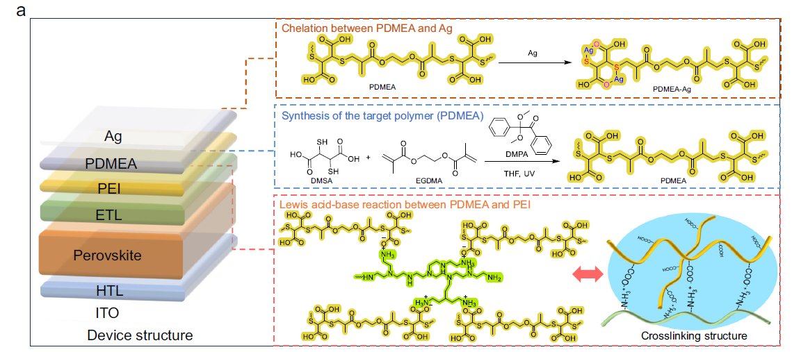 The study addresses the stability challenges arising from chemical interactions between metal electrodes and perovskite components by designing a bilayer multifunctional polymer buffer layer composed of polyethyleneimine (PEI) and 2-((2-methyl-3-(2-((2-methylbutanoyl)oxy)ethoxy)-3-oxopropyl)thio)-3-(methylthio)succinic acid (PDMEA), inserted at the interface between the metal electrode and the transport layer (Fig. 1). This buffer layer mitigates metal atom diffusion through the formation of thioether-metal-carboxylate chelation rings between the metal layer and PDMEA. Additionally, it facilitates efficient electron transport and suppresses interfacial recombination via in situ crosslinking between the carboxyl groups of PDMEA and the amine groups of PEI, based on Lewis acid-base reactions. Consequently, this design effectively reduces detrimental metal/ion interdiffusion during device fabrication and operation. Perovskite solar cells incorporating the PEI/PDMEA buffer layer achieved certified power conversion efficiencies of 26.46% (0.1 cm²) and 24.70% (1.01 cm²), along with improved thermal and operational stability. This bilayer polymer buffer strategy, formed by crosslinking polymers with distinct functionalities, provides a novel approach for the rational design of buffer layers in highly efficient and stable perovskite solar cells and other related electronic devices.