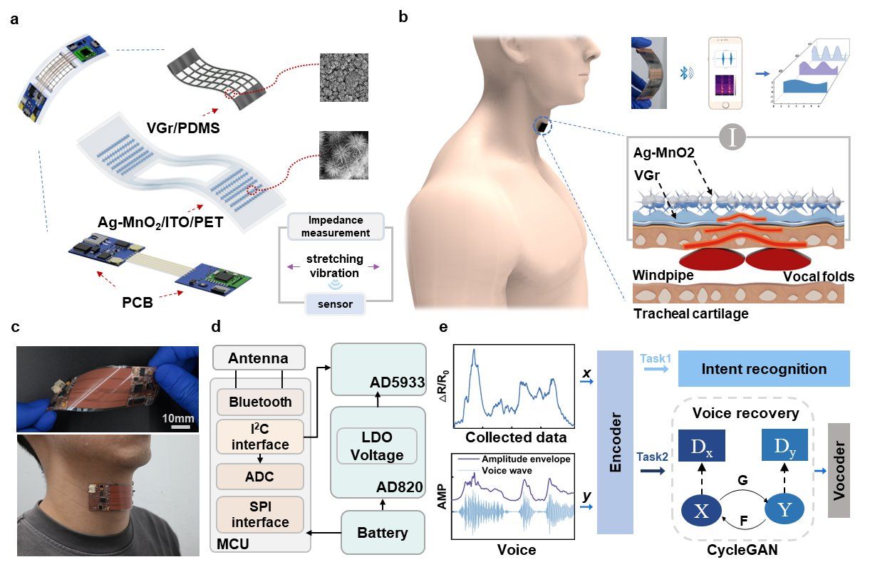 Stroke is a leading cause of long-term disability worldwide, with post-stroke aphasia significantly impairing communication and social interaction. Traditional rehabilitation devices are often bulky, expensive, and impractical for daily use, particularly in speech recovery, where accessible and effective solutions remain limited. To address this challenge, this study introduces a portable and wearable sensor system for stroke-induced aphasia rehabilitation. The proposed sensor integrates a flexible, ultrasensitive, and durable dual-sensor system comprising an Ag-MnO2-based sea-urchin-like nanopar-ticle pressure sensor to detect high-frequency vocal vibrations and a vertical graphene/polydimethylsiloxane (VGr/PDMS) strain sensor to capture low-frequency muscular movements. The sensors, integrated into a flexible circuit, employ an encoder-cycle-consistent generative adversarial networks (Cy-cleGAN) model that recognizes users’ intent and recovers voice, significantly reducing dependency on large-scale labelled datasets. Experimental results demonstrate accurate intent recognition with accuracies for certain commands exceeding 95%. The reconstructed speech exhibits improved naturalness based on objective and perceptual evaluations, highlighting potential clinical utility in enhancing daily communication and interaction for stroke survivors.