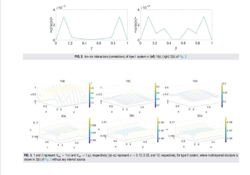 Poisson–Nernst–Planck equation is employed to describe ion transport disrupted by symmetric internal attractive and repulsive sources on the inner surface of nanomaterials in a vacuum. The present methodology has rapid computation time, where microscopic interactions are incorporated in the macroscopic equation to correct physics. Unlike usual molecular simulation, the present approach only requires static interactions between an ion and the host material, where the evolution of ion density and multi-body interactions between ions are captured by the Poisson–Nernst–Planck equation and Eq. (10), respectively. Both ion transport with and without such internal sources will be scrutinized so that the number of ionic layers can be finely tuned not only by external fields but also internal force sources to modify the charge and thermal capacities of nanomaterials. Last but not least, ion–ion interactions can be identified as ionic correlation functions so that the nonlinearity and the diffusion constant of the ion transport problem can be visualized and updated, respectively.