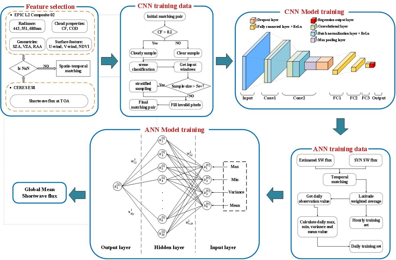 To address this challenge, the research group developed an innovative deep learning-based framework. This framework combines convolutional neural networks (CNNs) and a multilayer perception neural network (MLPNN). First, a total of 18 CNN models were developed (for nine scene types under both cloudy and clear-sky conditions) and trained using synchronous matchups of DSCOVR/EPIC observations and CERES SSF products. This achieves a high-precision retrieval of TOA shortwave flux directly from EPIC multispectral images. Second, an MLPNN model was developed to relate the EPIC-derived flux to the global TOA shortwave flux from CERES SYN products, exploring the potential of L1 observations to represent the global flux.
