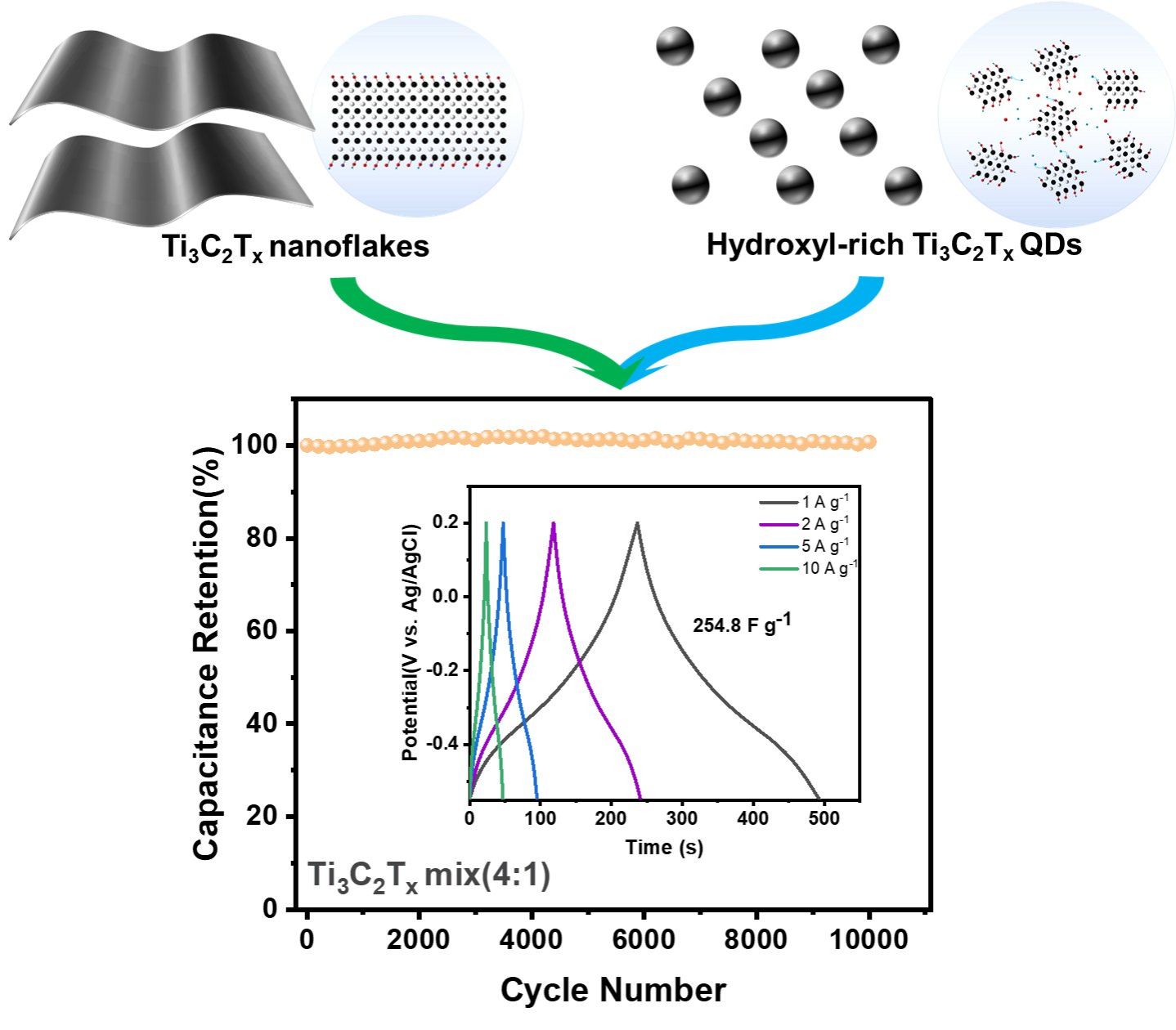 Figure 1. Hydroxyl-rich quantum dots enhance Ti3C2Tx pseudocapacitance by providing abundant redox-active sites and enabling rapid ion transport.