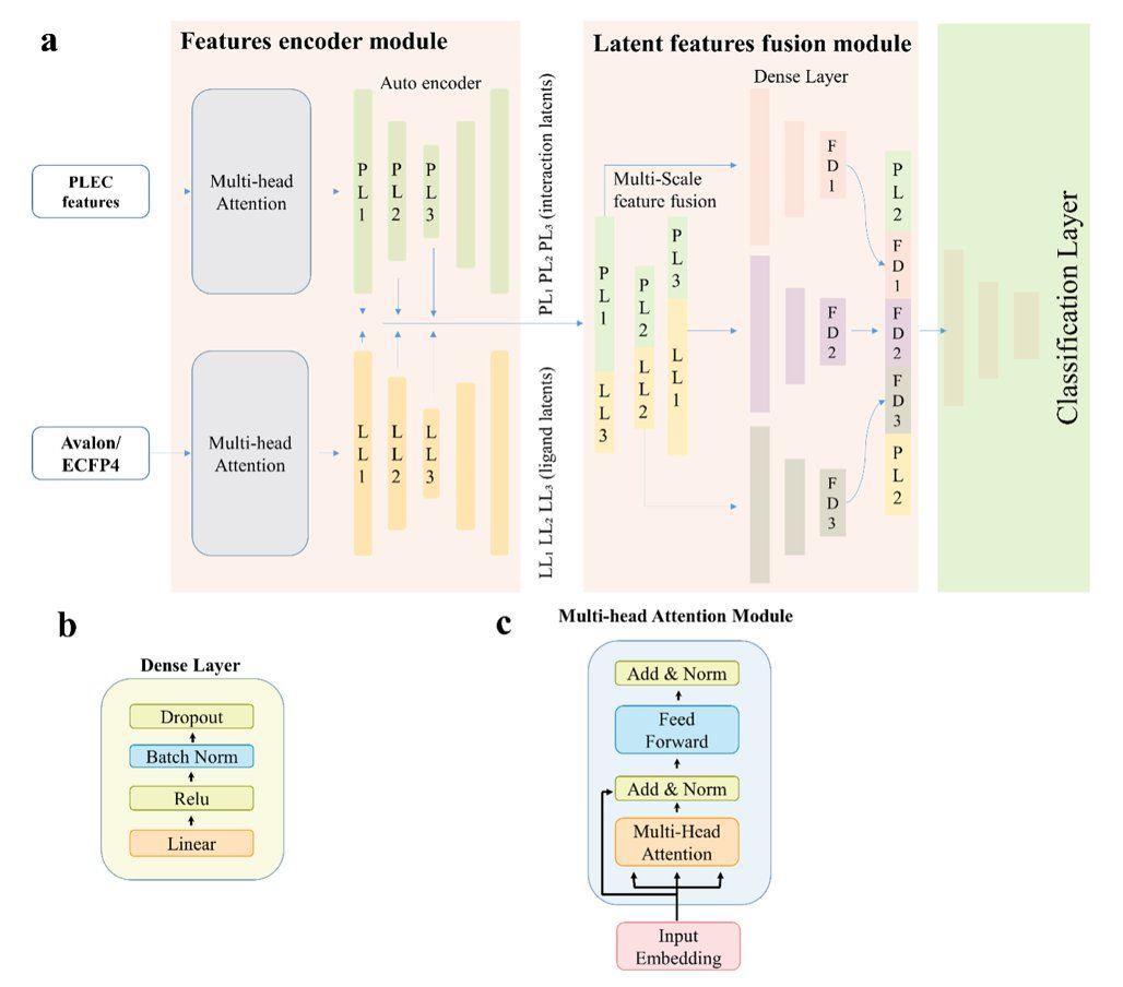 The proposed AttentionScore is a deep learning scoring function tailored to METTL3, integrating ligand fingerprint information (Avalon/ECFP4) and protein–ligand interaction fingerprints (PLEC) within a unified end-to-end framework. The model includes three key design elements: a multi-head attention encoder to extract informative signals while suppressing redundancy; an autoencoder-style latent representation for compression and denoising to improve stability; a multiscale latent feature fusion module that cross-couples ligand and interaction information at different levels and preserves robust mid-level signals through skip connections, achieving a better balance between performance and generalization.