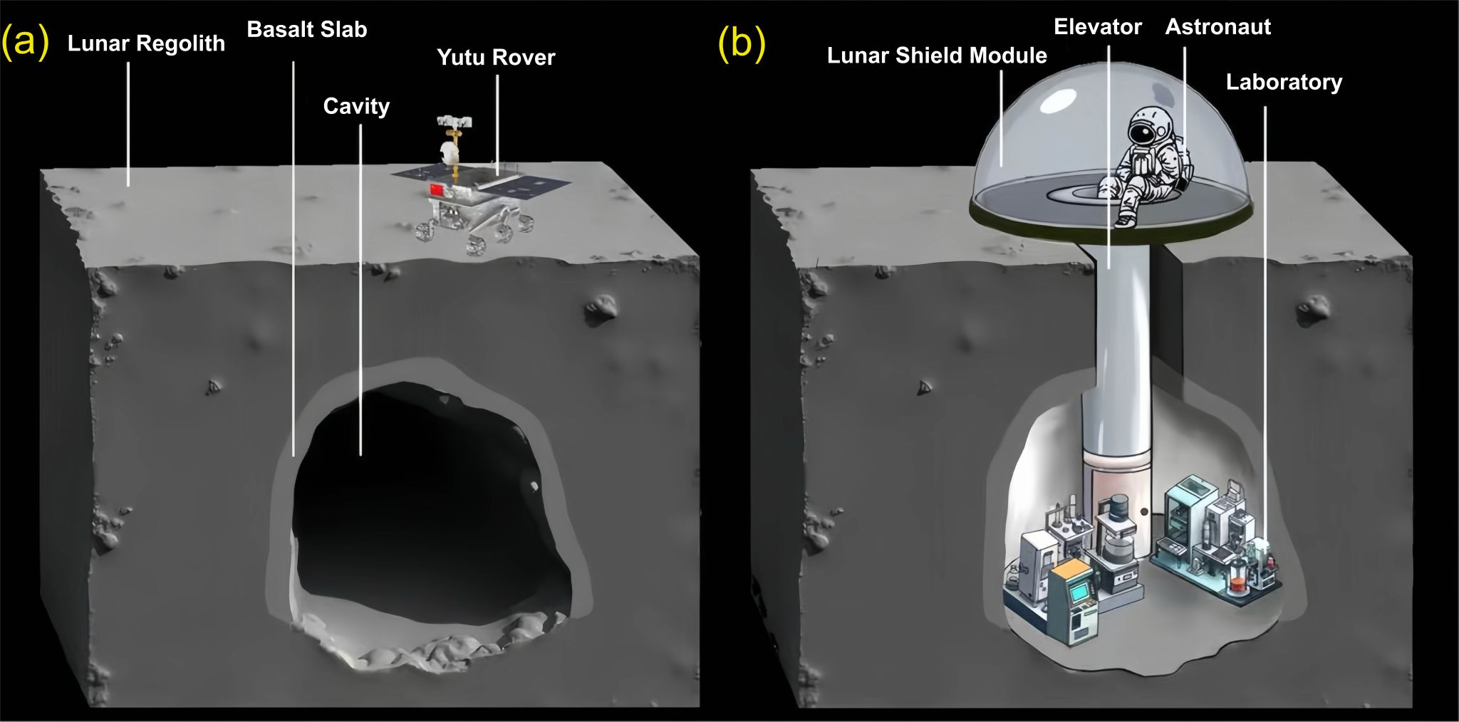 Figure 1. Schematic of future base construction in the underground cavity for Chang’E-3, showing: (a) subsurface cavity and (b) scheme for future base construction after excavating the underground cavity