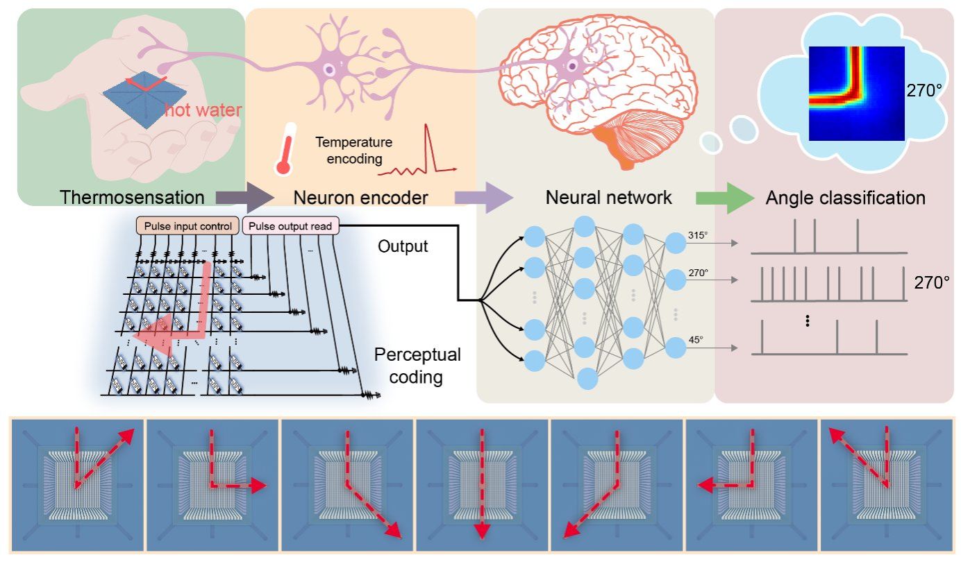 Precise and intelligent temperature monitoring in microfluidic systems is significant for improving efficiency and reducing costs across various applications in biology, chemistry, and medicine. Biomimetic sensing technologies integrated with on-chip pulse encoding offer a promising strategy by directly capturing temperature signals and encoding them for further processing, while providing advantages including high-density integration and low energy consumption. The threshold-switching memristor (TSM), configured to simulate leaky integrate-and-fire (LIF) neurons, is particularly appealing as it combines sensing and encoding functionalities within a single device. However, achieving high-performance TS characteristic and temperature sensitivity in TSM-based LIF neurons remains a challenge. Here, a temperature-responsive TSM is presented with low operating voltage by using Mo0.5W0.5S2 nanosheets (NSs)-polymer composite as resistive switching materials. The Mo0.5W0.5S2 NSs act as an “intermediate waystation” at the composite during the Ag ion migration process, facilitating the formation of conductive filaments and decreasing the operating voltage. A thermal flow angle recognition system is developed by integrating a 40 × 40 memristor array onto the microfluidic chip surface. With the assistance of a spiking neural network, seven categories of thermal flow angles can be successfully identified with a high accuracy of 99.75%, indicating the TSM's great potential in microfluidic chip temperature monitoring. The research was supported by the National Natural Science Foundation of China, the Basic and Applied Basic Research Foundation of Guangdong Province, the Science and Technology Innovation Commission of Shenzhen, RSC Sustainable Laboratories Grant, the State Key Laboratory of Radio Frequency Heterogeneous Integration (Independent Scientific Research Program), etc.
