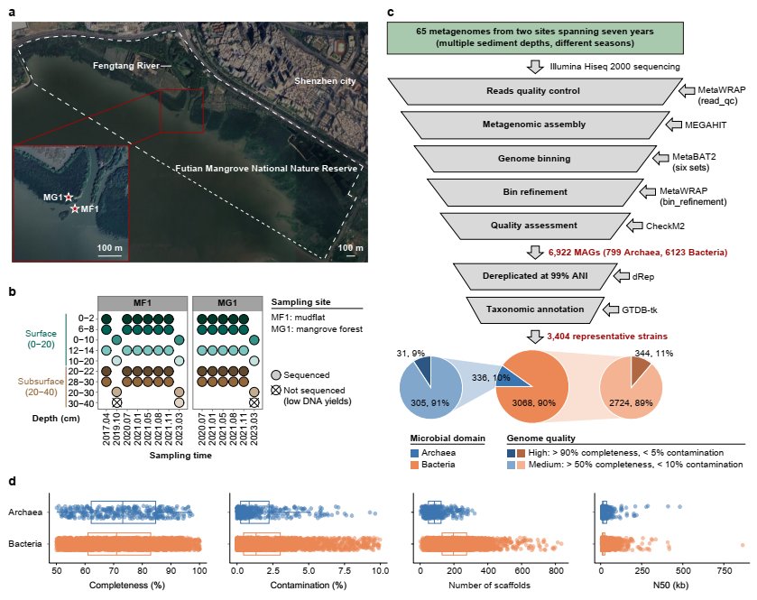 The core value of this study lies in the construction of a standardized, time-resolved genome catalogue of sediment microorganisms from a mangrove wetland ecosystem, together with the public release of raw sequencing data, assembled genomes, and detailed sample metadata. This resource will provide important support for future studies in coastal wetland microbial ecology, comparative genomics, environmental functional mining, and ecological restoration assessment. It also establishes a long-term data foundation for further understanding the ecological functions of mangrove “blue carbon” systems and their microbial drivers. This work was supported by the Guangdong Major Project of Basic and Applied Basic Research, the National Natural Science Foundation of China, the Shenzhen University 2035 Program for Excellent Research, the Shenzhen University Special Funding Initiative, the General Program of the Shenzhen Natural Science Foundation, the Synthetic Biology Research Center of Shenzhen University, and the Intelligent Computing Center of Shenzhen University.