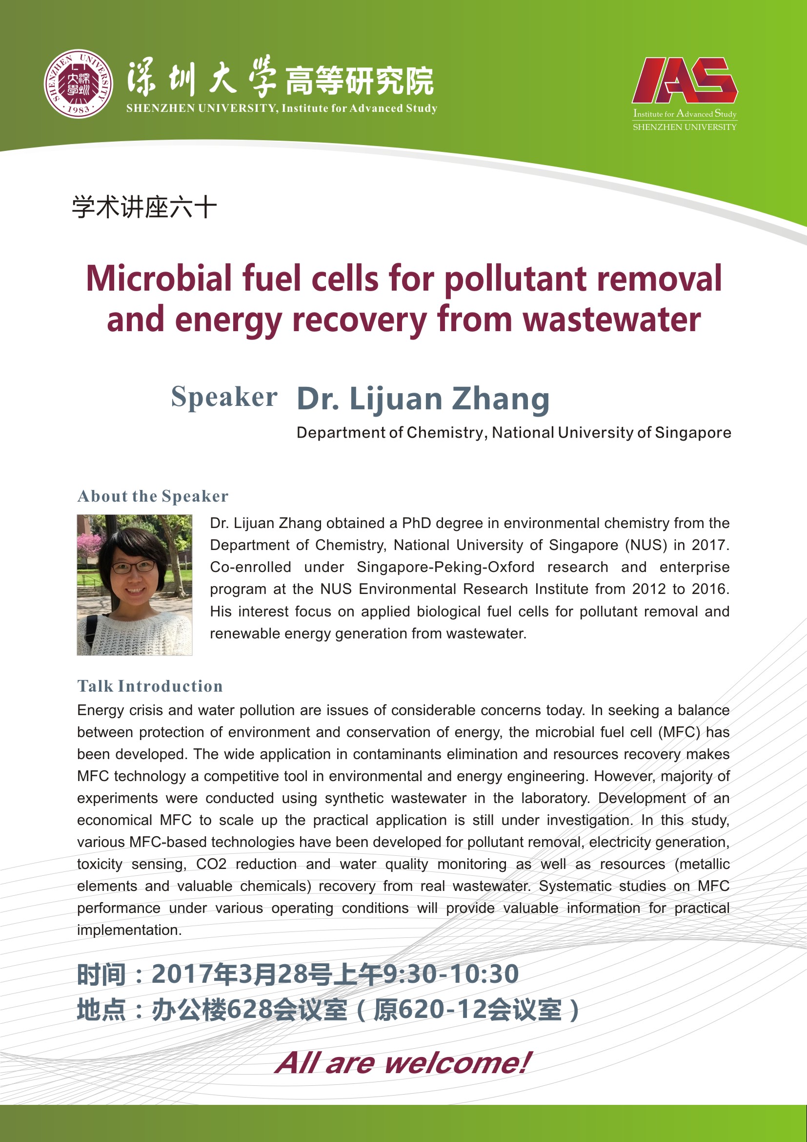 Dr. Lijuan Zhang obtained a PhD degree in environmental chemistry from the Department of Chemistry, National University of Singapore (NUS) in 2017. Co-enrolled under Singapore-Peking-Oxford research and enterprise program at the NUS Environmental Research Institute from 2012 to 2016.His interest focus on applied biological fuel cells for pollutant removal and renewable energy generation from wastewater.