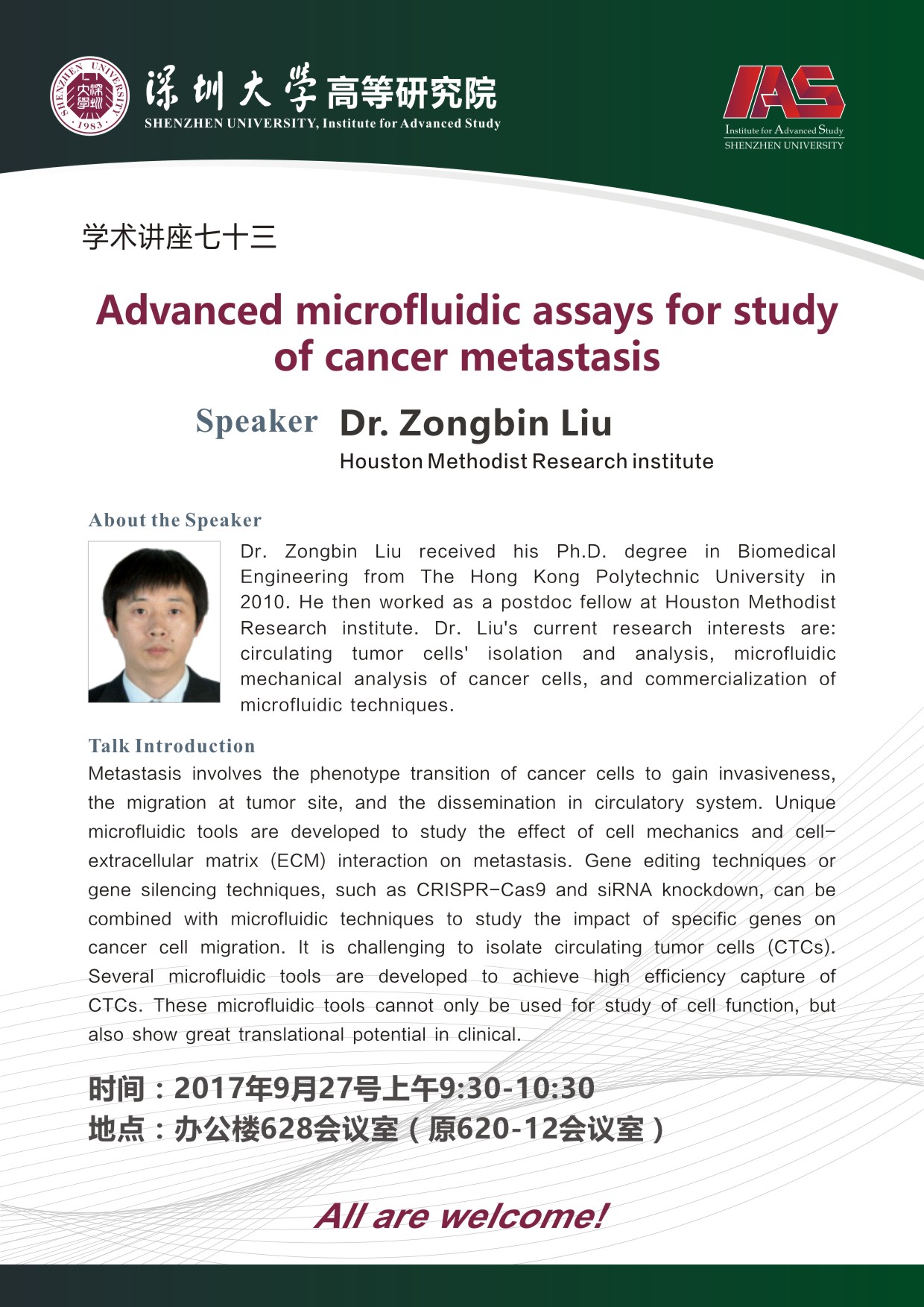 Dr. Zongbin Liu received his Ph.D. degree in Biomedical Engineering from The Hong Kong Polytechnic University in 2010. He then worked as a postdoc fellow at Houston Methodist Research institute. Dr. Liu’s current research interests are: circulating tumor cells’ isolation and analysis, microfluidic mechanical analysis of cancer cells, and commercialization of microfluidic techniques.