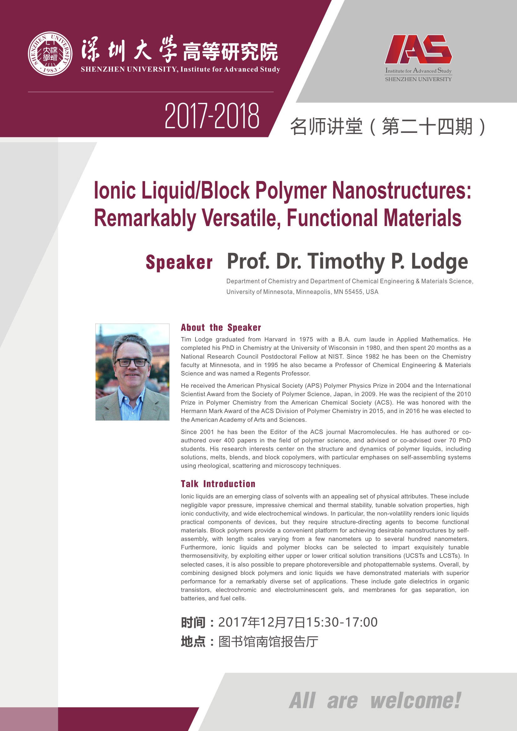 Tim Lodge graduated from Harvard in 1975 with a B.A. cum laude in Applied Mathematics. He completed his PhD in Chemistry at the University of Wisconsin in 1980, and then spent 20 months as a National Research Council Postdoctoral Fellow at NIST. Since 1982 he has been on the Chemistry faculty at Minnesota, and in 1995 he also became a Professor of Chemical Engineering &Materials Science and was named a Regents Professor.