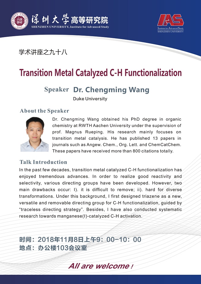 Dr. Chengming Wang obtained his PhD degree in organic chemistry at RWTH Aachen University under the supervision of prof. Magnus Rueping. His research mainly focuses on transition metal catalysis. He has published 13 papers in journals such as Angew. Chem., Org. Lett. and ChemCatChem. These papers have received more than 800 citations totally.