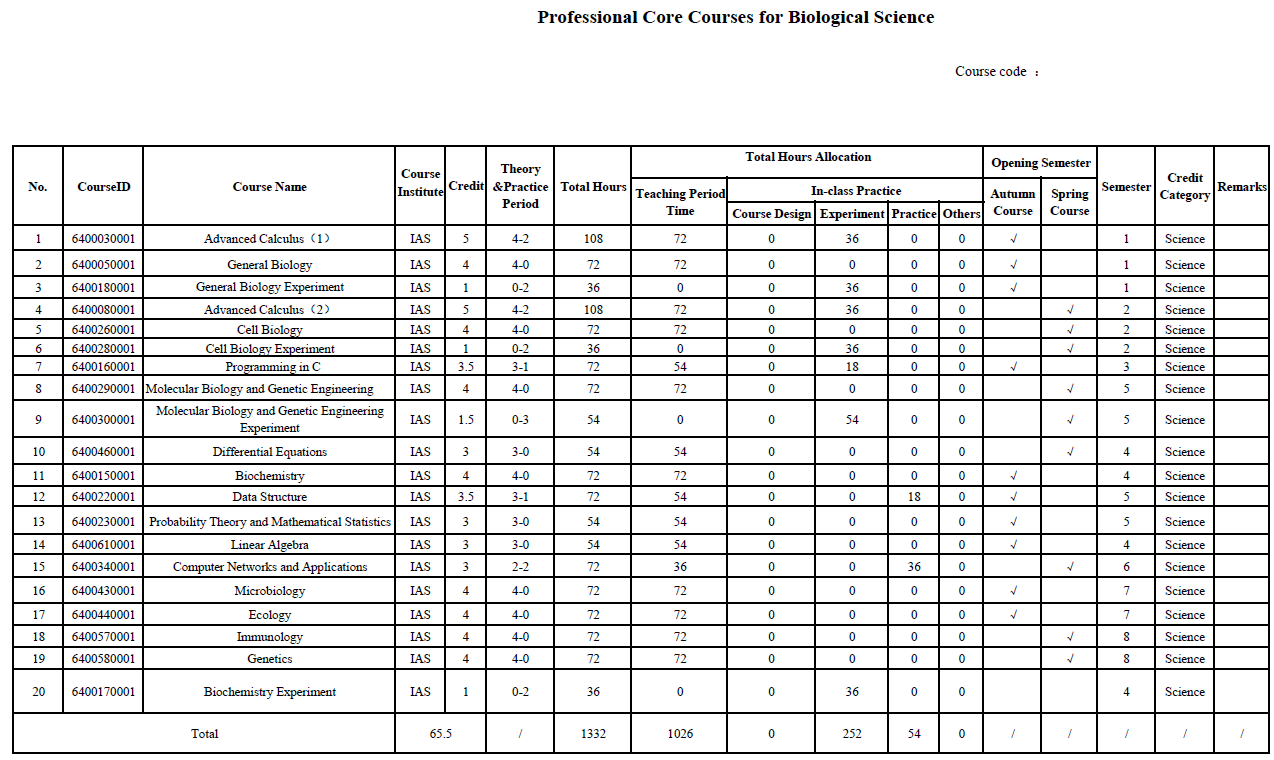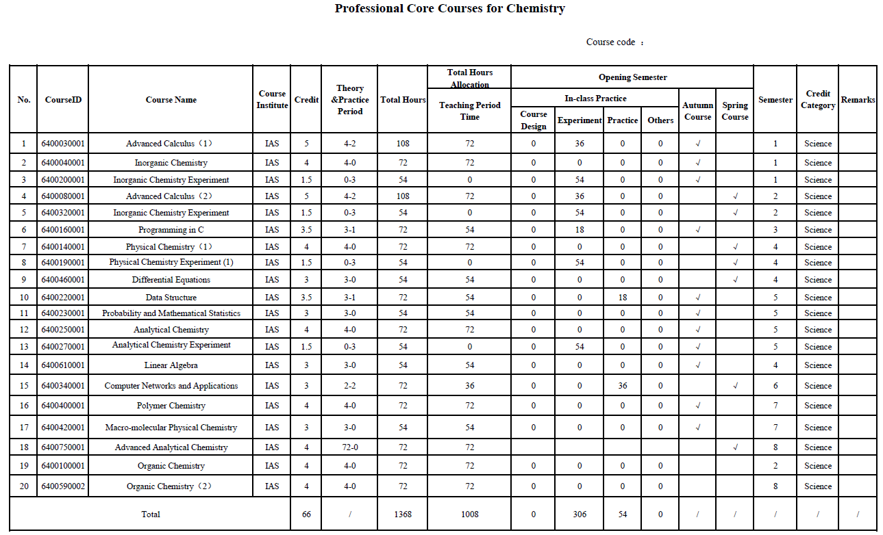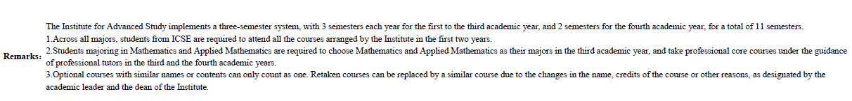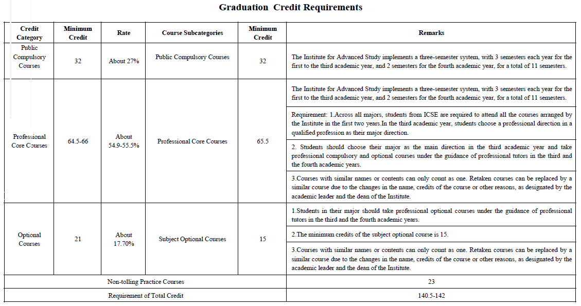 The undergraduate training program of the Innovation Class in Science and Engineering (ICSE) is revised under the supervision and audit of the Teaching Instruction Committee of the Institute every year. The following courses and graduation credit requirements are applied by the four majors of grade 2016: Chemistry, Physics, Biological Science and Mathematics and Applied Mathematics.