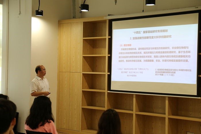 在随后的讲座中,李猛教授提到微生物组和合成生物,是我国“十四五”规划和2035年远景目标纲要中明确所提出的两个“科技前沿领域攻关”方向。围绕这两个方向,我国已实施了一批具有前瞻性、战略性的国家重大科技项目。报告结合了李猛教授团队近年来的研究基础,简要介绍国内外微生物组和合成生物的发展方向,以期更好促进学院内外科研交流与合作,为开展学科交叉研究和人才培养提供线索。