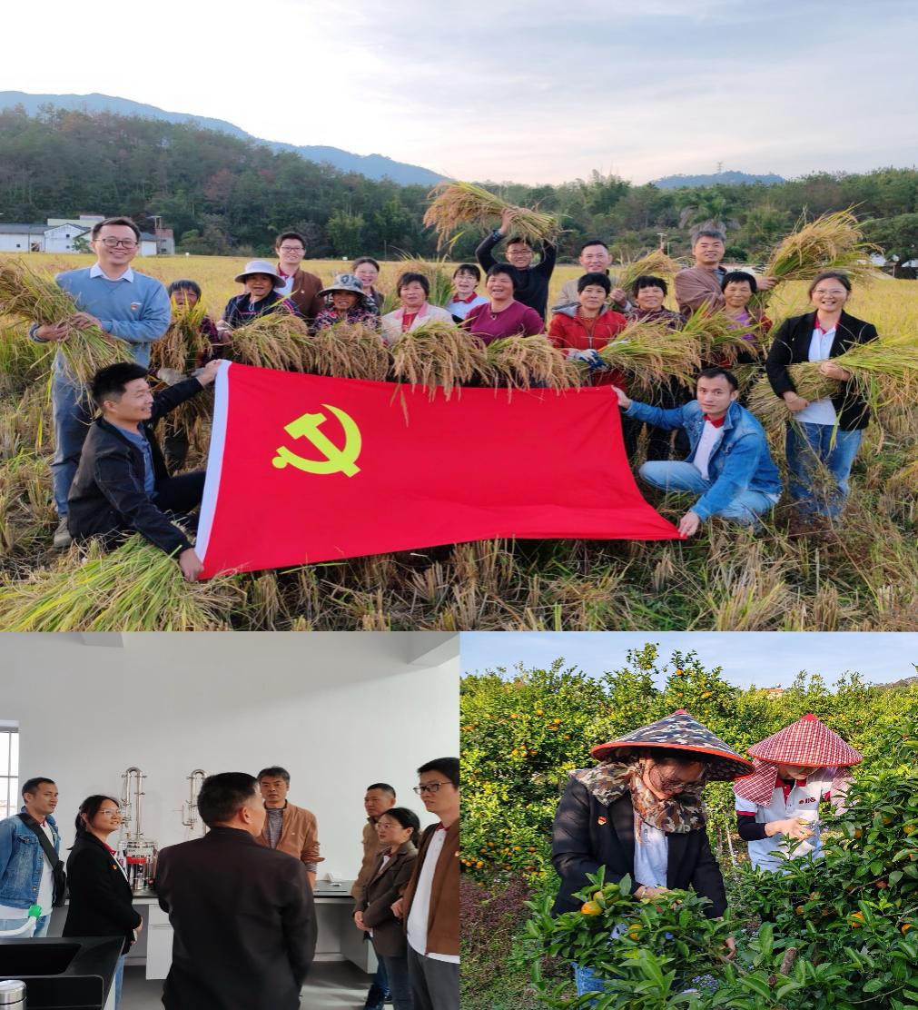 党员同志们首先走近日光村的沙糖桔和水稻种植地,考察沙糖橘适宜生长的气候条件、土壤要求等种植知识,采摘水果农作物帮扶果农,随后参观玫瑰种植基地,深入了解玫瑰生产、加工、销售、包装产业链。就部分水果或农作物在有机化学、食品营养、工艺萃取、生物合成等方面进行深入交流,并向当地群众、工作队深入交流相关研学与实践结合的方向和方法,旨在探索进一步的研学契机或实践合作。支部同志们实地走向田间地头,走近人民、向人民学习、服务人民,大家实地积极开展劳动锻炼、体验秋收割稻的劳动快乐。