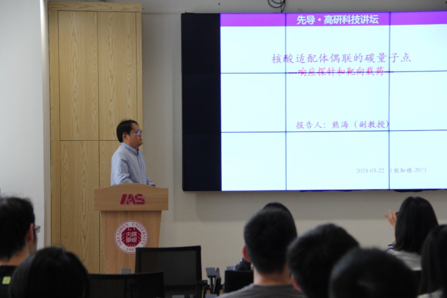 3月22日下午,高等研究院主办的先导·高研讲坛(第十五讲)在致知楼207活动中心开讲。深圳大学高等研究院副教授熊海作题为“核酸适配体偶联的碳量子点:响应探针和靶向载药报告”的报告,高等研究院党委书记邱妙芳、院长李猛及学院20余名师生参加此次讲座。学院副院长、党委教职工支部书记李晓光担任此次讲座主持。