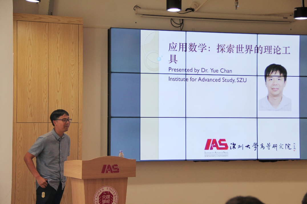 5月17日下午,高等研究院主办的先导·高研讲坛(第十七讲)在致知楼207活动中心开讲。深圳大学高等研究院陈誉副教授作题为“应用数学:探索世界的理论工具”的报告,高等研究院院长李猛、副院长李秀婷及学院20余名师生参加此次报告。学院副院长、数理化党支部书记李晓光担任此次讲座主持。
