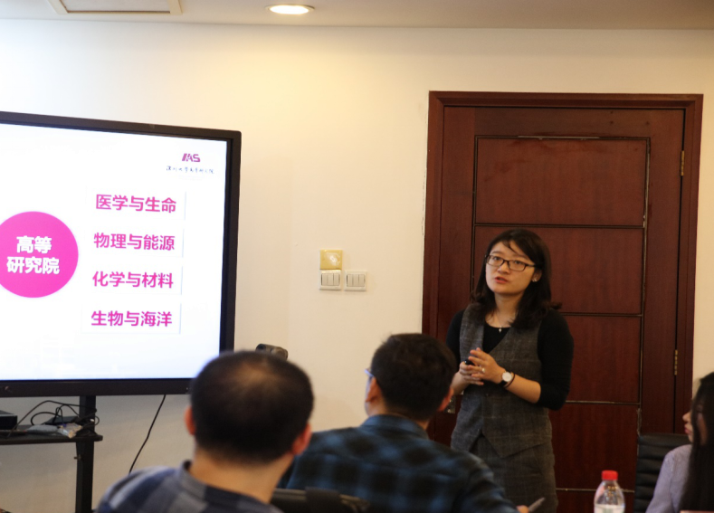 韦阳博士首先代表高等研究院全体教职工对于刘琦教授一行的到来表示热烈欢迎,并简要介绍了深圳大学的发展情况,就高等研究院的概况、研究方向和实验室作了详细介绍。