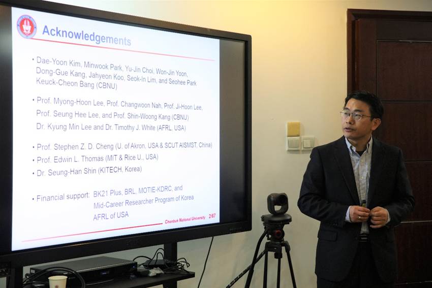应高等研究院的邀请,韩国全北国立大学Kwang-UnJeong教授于2019年1月16日下午,在深圳大学办公楼207会议室做了题为“Multifunctional Thermoset Thin Films from Programmed Liquid CrystalMonomers”的学术报告。高等研究院研究员曹艳老师主持了本期讲座活动,学院博后及部分学生参加了本次学术报告会。