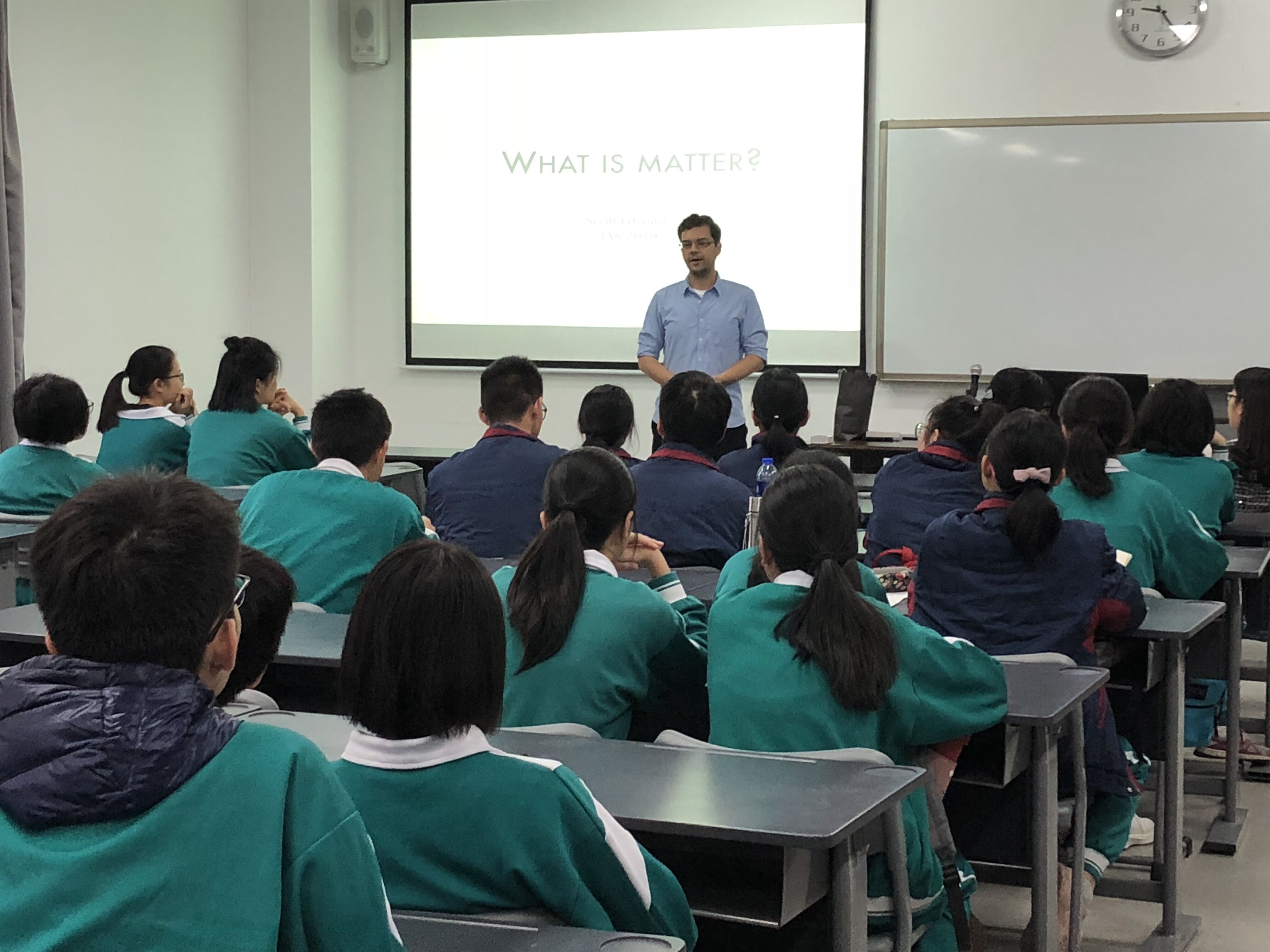 韦阳博士首先向来访师生表示热烈欢迎,并详细地介绍了高等研究院的办学宗旨、办学特色、办学目标、国际交流、师资力量、毕业去向、学生风采以及招生选拔方式。她表示,高等研究院“理工创新实验班”和“金融科技实验班”以高精尖及创新型本科人才为培养目标,高等研究院在此诚挚地欢迎广大学子报考。澳籍老师Scott Edwards还给同学们带来一场有趣的大学物理体验课,赢得来访师生的阵阵掌声。