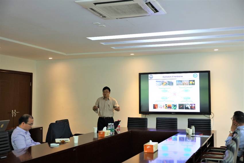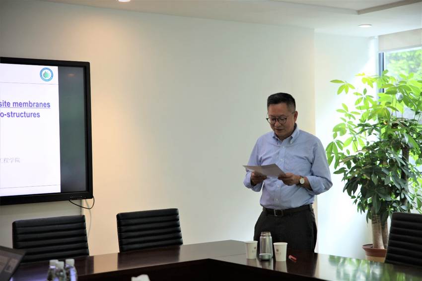 牛青山教授指出纳滤、反渗透等膜基技术具有能耗低、分离效率高等优点,在海水淡化和废水处理领域具有广阔的应用前景。在报告会上,牛青山教授介绍了一种基于大循环多酚分子Noria和聚乙烯亚胺(PEI)的共沉积的超快速通用表面改性策略。采用传统的界面聚合(IP)方法,以Noria-PEI共沉积膜为中间层,可制备薄膜复合纳滤膜(TFC)。支撑表面上的锚定Noria与水相中的胺单体之间的主客体非均匀相互作用可以显著改变IP过程,并有助于形成独特的纳米Trand混合形态,从而大大提高NF分离性能。利用原位策略在Noria-聚乙烯亚胺(PEI)改性的中间层表面上合成沸石咪唑酯骨架-8(ZIF-8)纳米晶体,用于制备薄膜纳米复合物(TFN)RO膜。制备的TFN膜的透过率比初生膜高近3倍,但对NaCl仍有很高的排斥性。牛青山教授在报告会上介绍的原位组装策略为今后用其它纳米材料制备TFN-RO膜奠定了良好的基础。最后,牛青山教授为此次讲座做了全面总结:界面聚合是当今反渗透材料制作过程中的奇迹;精确控制这一反应的动力学对膜结构的形成及膜性能至关重要;基于反渗透和纳滤复合膜的新型分离技术是21世纪最为引人注目的新型分离技术之一,在资源、环境等重大需求领域有着非常广阔的应用前景。