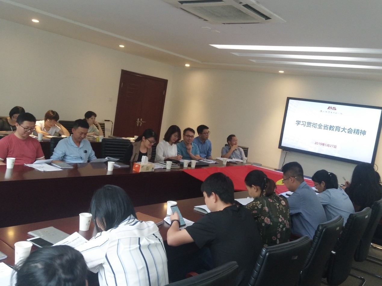 2019年5月27日,高等研究院党支部在办公楼103会议室召开了全体党员大会,会议集中学习了“习近平总书记在纪念五四运动100周年大会上重要讲话精神”及“全省教育大会精神”。高等研究院副院长明海燕同志,专职教师党员周晔、潘科、熊海、李晓光等同志,博士后党员、学生党员及南特商学院党员等悉数参加会议,会议由高等研究院党支部书记韦阳同志主持。