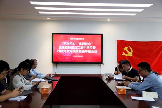 2019年10月29日,高等研究院党支部在汇元楼103会议室举行了“不忘初心、牢记使命”主题教育第五次集中学习活动暨“对照党章党规找差距”专题会议。会议由高等研究院党支部书记韦阳同志主持,全体党员参加会议。