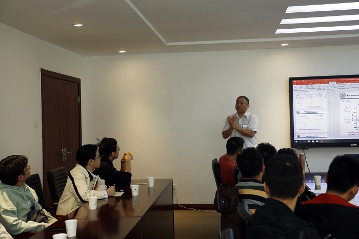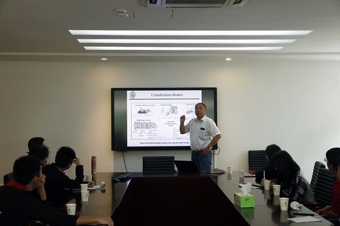 上午10:00,Toshikazu Miyoshi教授在汇元楼103会议室做了题为“Structure and Molecular Dynamics of Semicrystalline Polymers by Solid-state NMR”的报告。固态核磁光谱学是研究分子尺度上有机分子的局部结构和动态力学的强大工具之一,而Toshi Miyoshi教授则是利用固态核磁研究结晶聚合物的世界级顶级教授,他在报告中细致地介绍了如何利用固态核磁光谱研究多种结晶聚合物的结构和分子动力学。教授先科普了一番溶液和熔体生长晶体中长聚合物链的折叠结构,接着又讲起了化学反应关联的聚丙烯腈碳纤维,最后总结了结晶聚合物的分子动力学的研究方法。整场讲座干货满满,学生们也听得聚精会神。